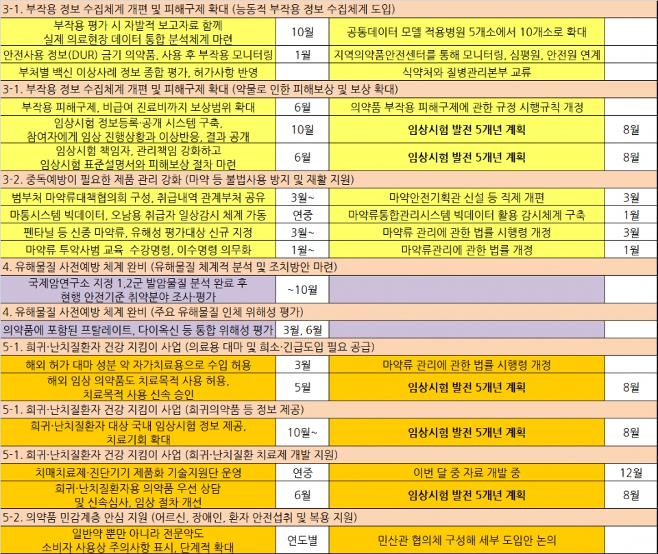 식약처는 '임상시험 발전 5개년 종합계획'을 통해 희귀난치질환자의 치료 기회 확대, 임상 참여자 보호, 제약사의 신약 개발 역량을 돕는 대책도 마련했다. 임상시험에 사용되는 모든 안전성 정보를 의무화하면서 안전성이 확보된 의약품이라면 임상 승인기간을 줄여주는 '차등승인제'를 도입했다. 긴급한 희귀난치질환자에게는 임상 시험약을 신청 당일에 치료용으로 쓸 수 있게 해 치료기회를 제공한다.
