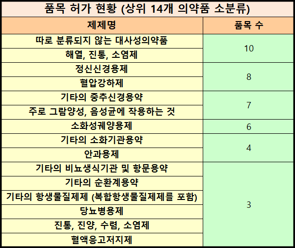 품목 허가 상위 14개 의약품 소분류는 ▶ 따로 분류되지 않는 대사성의약품 · 해열,진통,소염제 (각 10품목) ▶ 정신신경용제 · 혈압강하제 (각 8품목) ▶ 기타의 중추신경용약 · 주로 그람양성, 음성균에 작용하는 것 (각 7품목) ▶ 소화성궤양용제 (6품목) ▶ 기타의 소화기관용약 · 안과용제 (각 4품목) ▶ 기타의 비뇨생식기관 및 항문용약 · 기타의 순환계용약 · 기타의 항생물질제제(복합항생물질제제를 포함) · 당뇨병용제 · 진통,진양,수렴,소염제 · 혈액응고저지제 (각 3품목) 순이었다.