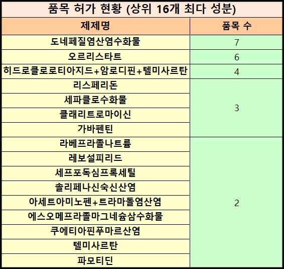 품목 허가 상위 16개 의약품 성분은 ▶ 도네페질염산염수화물 (알츠하이머치료제/7품목) ▶ 오르리스타트 (비만치료제/6품목) ▶ 히드로클로로티아지드+암로디핀베실산염+텔미사르탄 (고혈압치료제/4품목) ▶ 리스페리돈 (조현병치료제/3품목) · 세파클러수화물 (항생제/3품목) · 클래리트로마이신 (항생제/3품목) 등으로 집계됐다.