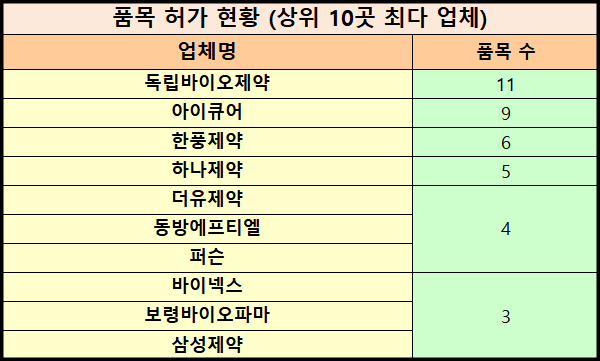 품목 허가 상위 10개 업체는 ▶ 독립바이오제약 (11품목) ▶ 아이큐어 (9품목) ▶ 한풍제약 (6품목) ▶ 하나제약 (5품목) ▶ 더유제약 · 동방에프티엘 · 퍼슨 (각 4품목) ▶ 바이넥스 · 보령바이오파마 · 삼성제약 (각 3품목) 등이었다.