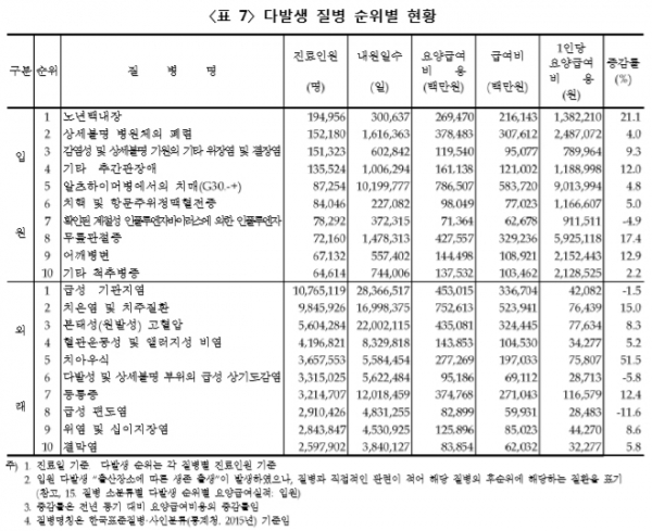 다발생 질병 1위는 입원의 경우 ‘노년백내장’(13만 5,682명), 외래의 경우 ‘본태성(원발성) 고혈압’(251만 947명)이었다. 요양급여비용이 가장 높은 질병은 입원의 경우 ‘알츠하이머병에서의 치매’(7748억원), 외래의 경우 ‘치아 및 지지구조의 기타 장애’(7894억원)로 집계됐다.