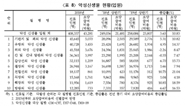 악성신생물로 입원한 진료인원은 25만 8084명이었다. 요양급여비용은 2조3807억원으로 전년 동기 대비 10.83% 증가했다. 다발생 암 중 입원 요양급여비용 증가율이 가장 높은 암은 전립선암으로 21.04%(89억 원) 상승했고, 다발생 암 중 입원 요양급여비용 증가액이 가장 높은 암은 폐암으로 271억원(10.82%) 늘었다.