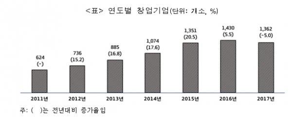 최근 7년간(’11년~’17년) 창업기업은 총 7462개였다. 연도별 창업기업 수는 2011년 624개, 2012년 736개, 2013년 885개, 2014년 1074개, 2015년 1351개, 2016년 1430개, 2017년 1362개로 대폭 증가했다.