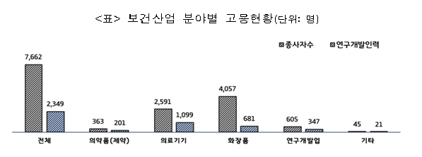 역시 화장품분야가 3513(47.1%)개로 가장 큰 비중을 차지했으며, 의약품 341개(4.6%), 의료기기 2,879개(38.6%), 연구개발업 666개(8.9%), 기타 63개(0.8%) 등으로 나타났다.