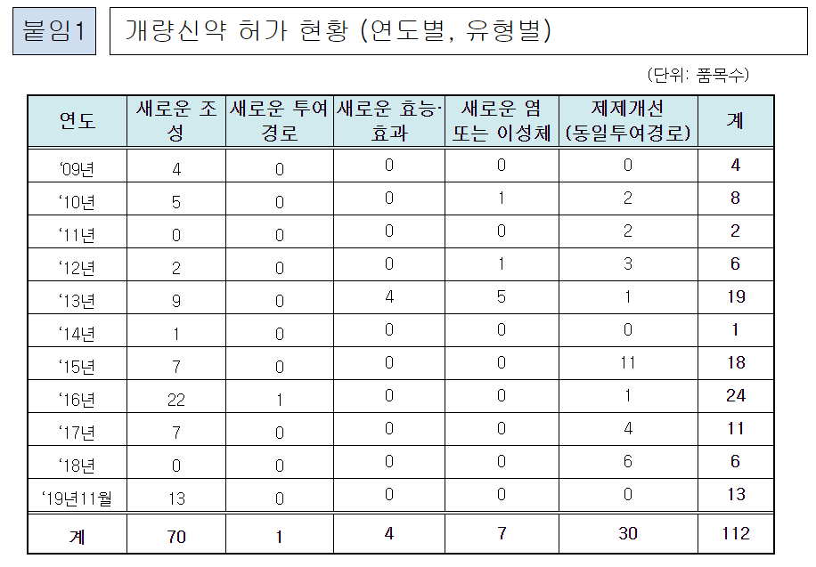 현재 식약처는 새 조성 복합제의 경우 임상시험자료를 통해 안전성(부작용 감소)이나 유효성(치료효과 상승) 개선을 입증해야 개량신약으로 인정하고 있다. 따라서 지난해(2018년) 새로운 조성 자료제출의약품의 허가가 111품목이나 이뤄졌지만 대부분 복용약물 개수 감소 이외 유효성이나 안전성 개선이 인정되지 않아 개량신약으로 인정된 품목은 전무했다.