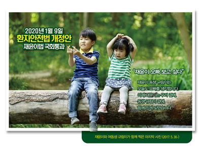 재윤이 오빠가 하늘나라에 살고 있다고 생각하는 여섯 살 여동생 규림이는 "하늘에 미세먼지가 많아서 하늘나라에 있는 오빠가 힘들겠다."며 걱정을 한다. 이제 ‘재윤이법’이 국회를 최종 통과했으니 재윤이는 하늘나라 뿐 만 아니라, 우리 곁에도, 동생 규림이 곁에도 함께 있을 것이다.