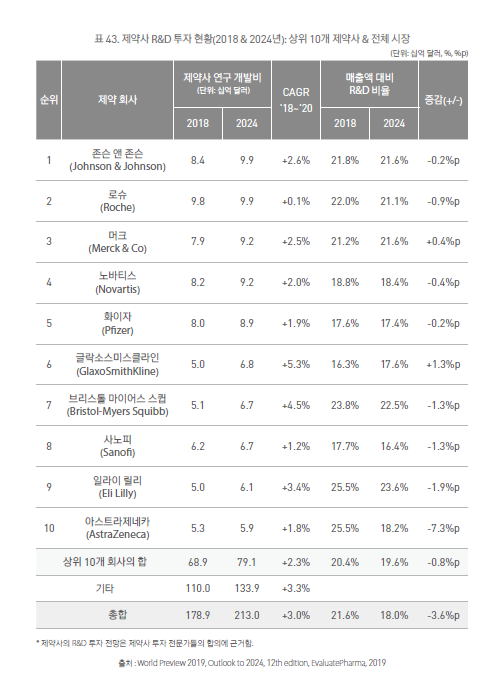 글로벌 제약사 존슨 앤 존슨(J&J)과 로슈가 2024년도 연구개발(R&D)에 가장 많은 투자를 하는 제약사가 될 것이란 전망이 나왔다.