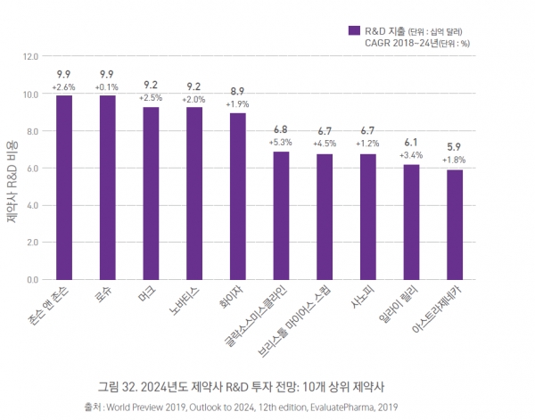 글로벌 제약사 시장조사 업체 ‘이벨류에이트파마’는 이 같은 내용의 분석 보고서를 발표됐다. J&J와 로슈 모두 2024년이 되면 R&D 투자비용이 99억달러(약 11조4473억원)에 달할 것으로 관측됐다. 또 상위 10대 제약사 중 일라이 릴리는 매출액 대비 연구개발비 투자 비중이 23.6%로 가장 높을 것으로 분석됐다.