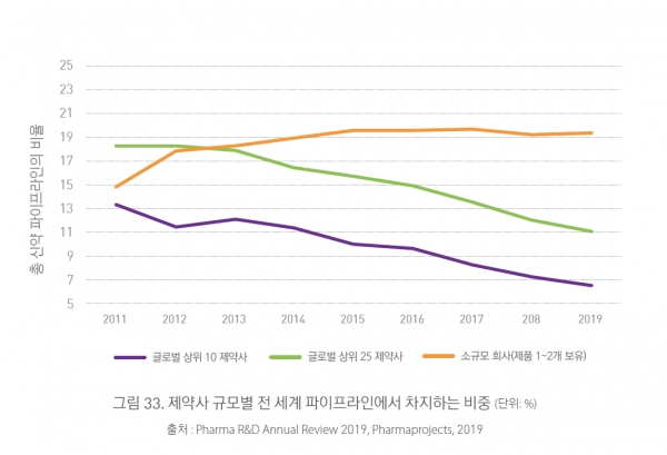 글로벌 상위 10개 제약사, 글로벌 상위 25개 제약사, 소규모 제약사(바이오벤처 등 제품 1-2개를 보유하고 있는 곳)를 비교해 봤을 때, 글로벌 상위 제약사의 파이프라인 비중은 낮아진 반면 소규모 회사가 차지하는 비중은 약 15%에서 지속적으로 증가해 전체 파이프라인의 20% 규모에 이르는 것으로 나타났다.