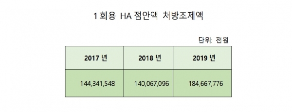 1회용점안액 유비스트 처방조제액 분석을 보면 2018년 1400억원에서 2019년 1850억원으로 대폭 증가 했다. 이는 그동안 업계가 1회용 점안제 약가 재평가 간담회 때 '고용량(0.7ml 이상 제품)제품이 그 동안 정부나 일부 기관에서 주장해 온 매출증대를 위한 보험약가 꼼수가 아니라 환자의 편의성을 고려한 것이며, 1관당 평균 390원대 제품들이 198원으로 일괄 인하되면 저용량 처방량이 대폭증가해 보험재정을 더 어렵게 할 것'이라고 줄기차게 주장했었다.