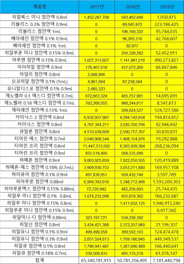 1회용점안액의 약가 재평가 목적은 1회용 용도에 맞게 1회만 쓰고 버려야 한다는 취지였다. 정부가 1회용 적정용량 기준을 0.3ml~0.5ml 설정하고, 가중평균을 적용해 용량에 상관없이 단일약가제도로 시행함으로써 실제로 상당수 회사의 0.7ml~1ml 제품들은 시장에서 철수하거나 큰폭으로 감소했다( 표2참조 2018년 5백억시장~ 2019년 71억으로 대폭감소 ). 1회용점안제 약가인하 소송에 참여하는 일부 회사의 고용량 제품만 청구액이 증가했다.