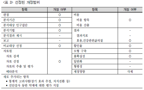 개정 범위는 기존 논의 결과와 제외국 가이드라인 개정 방향을 검토한 뒤 이해관계자 설문조사·전문가 자문회의를 통해 선정됐다. 분석관점, 분석기간, 분석대상 인구집단, 분석기법, 비교대안, 간접비교(자료원), 비용, 효용, 통계 관련 이슈, 할인율, 모형 구축, 진단검사 동반 약물, 불확실성 등이다.