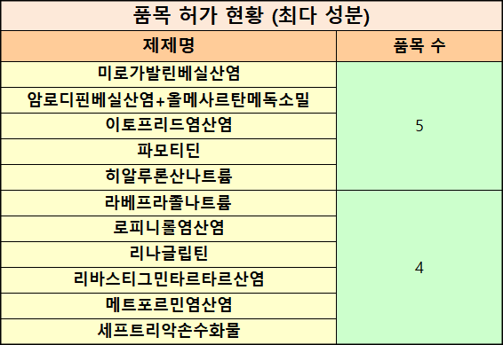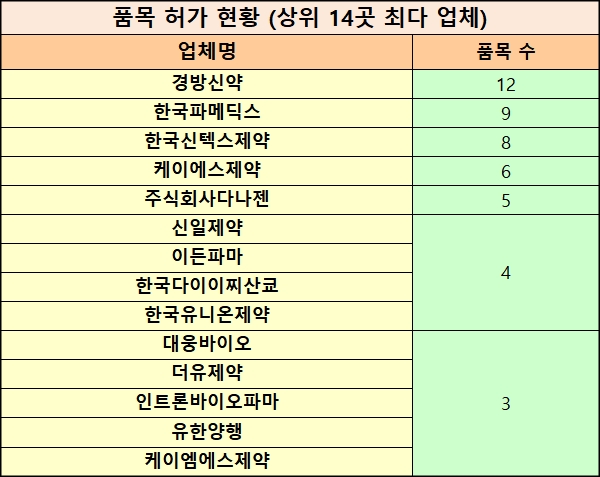품목 허가 상위 14개 업체는 ▶경방신약 (12품목) ▶한국파메딕스 (9품목) ▶한국신텍스제약 (8품목) ▶케이에스제약 (6품목) ▶주식회사다나젠 (5품목) ▶신일제약 · 이든파마 · 한국다이이찌산쿄 · 한국유니온제약 (각 4품목) ▶대웅바이오 · 더유제약 · 인트론바이오파마 · 유한양행 · 케이엠에스제약 (각 3품목) 순이었다.