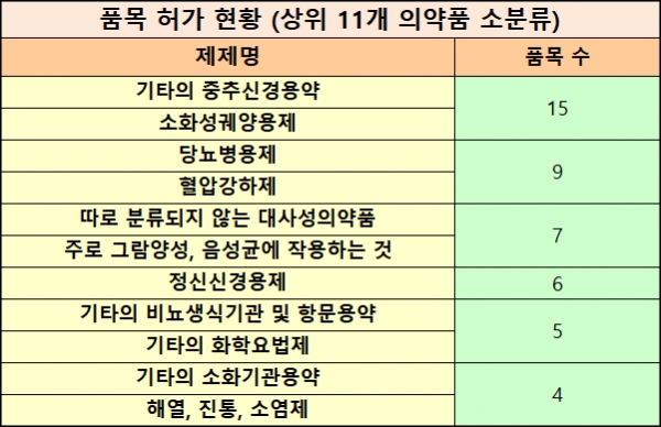 품목 허가 상위 11개 의약품 소분류는 ▶기타의 중추신경용약 · 소화성궤양용제 (각 15품목) ▶당뇨병용제 · 혈압강하제 (각 9품목) ▶따로 분류되지 않는 대사성의약품 · 주로 그람양성, 음성균에 작용하는 것 (각 7품목) ▶정신신경용제 (6품목) ▶기타의 비뇨생식기관 및 항문용약 · 기타의 화학요법제 (각 5품목) ▶기타의 소화기관용약 · 해열,진통,소염제 (각 4품목) 등으로 집계됐다.