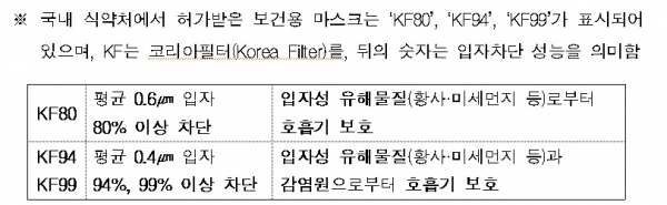 한편, 코로나바이러스 감염 예방을 위해서는 ‘KF94’, ‘KF99’ 등급 마스크를 사용해야 한다는 게 식약처 설명이다.