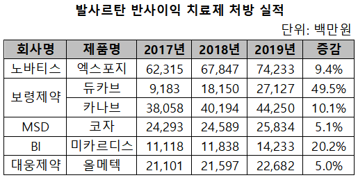 한편, 발사르탄 사태로 판매중지된 국내 70개사 175품목 중 153품목은 지난해 4분기부터 급여 처방이 가능해졌지만, 지난해 4분기 전체 처방실적은 전년동기 200억원에서 96% 감소한 7억원에 불과했다. 엑스포르테 등 32품목을 제외한 나머지는 판매중지 이후 처방 실적도 잡히지 않았다. 발사르탄 단일제의 경우 103억원에서 92% 하락한 9억원의 처방액을 기록했다.