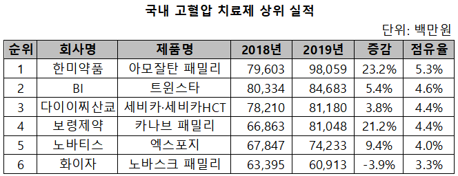 국내 고혈압 전체 시장 점유율 1위는 5.3%를 차지하는 한미약품의 아모잘탄 패밀리(아모잘탄·아모잘탄큐·아모잘탄플러스)다. 2018년 796억원에서 지난해 981억원으로 23.2% 성장률을 기록했는데, 아모잘탄(암로디핀·로사르탄)은 전년대비 10% 늘어난 741억원, 아모잘탄 플러스(암로디핀·로사르탄·클로르탈리돈)와 아모잘탄큐(로사르탄·로수바스타틴)는 각 84%·164% 성장한 182억원·58억원을 달성했다.