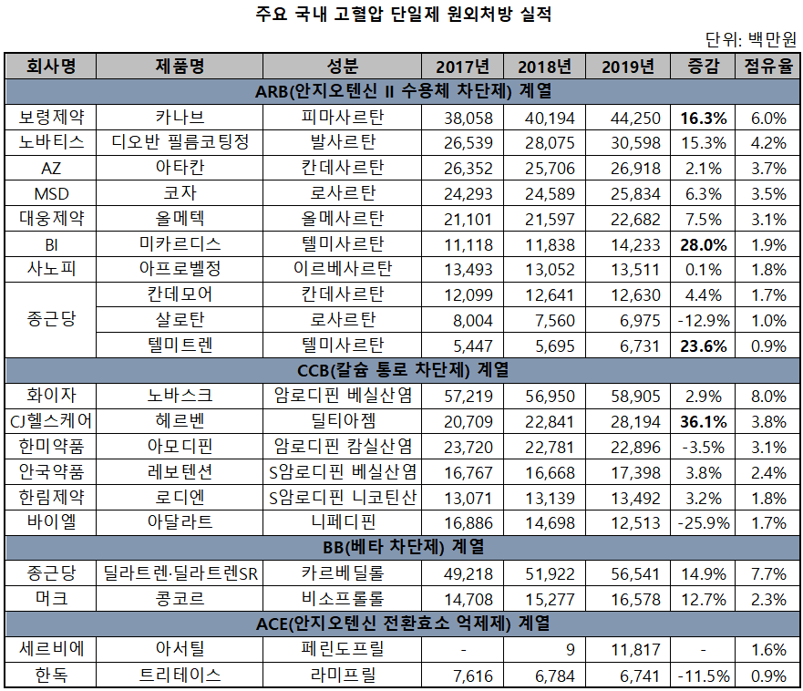 대세로 자리잡은 복합제에 밀려 제네릭 단일제 대부분은 소폭 하락하거나 제자리걸음인 반면, 디오반(발사르탄)·미카르디스(텔미사르탄) 등 오리지널 단일제는 준수한 성장폭을 보였다.