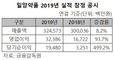일양약품(대표 김동연)은 연결 기준 2019년 매출·영업이익이 전년 대비 8%·94% 증가한 3246억원·324억원을 기록했다고 3일 공시했다. 당기순이익은 32억원에서 195억원으로 무려 499% 늘었다.