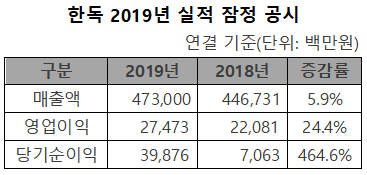 한편, 이날 한독은 개별 기준 잠정 실적도 공시했다. 금융감독원에 따르면, 2019년 매출액은 전년동기 대비 6% 증가한 4664억원·영업이익은 22% 증가한 300억원이며, 당기순이익은 전년동기 대비 41% 감소한 116억원을 기록했다.