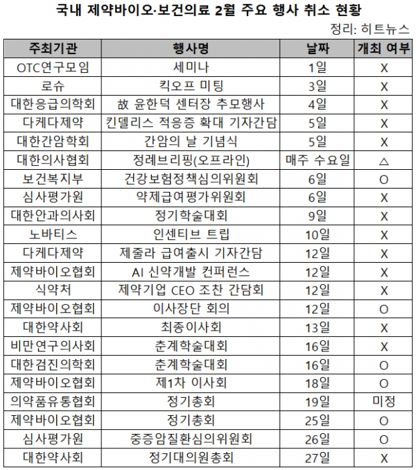 5일 업계에 따르면, 절반이 넘는 보건의약 기관·단체에서 이번 달 예정된 행사의 무기한 연기를 선언했다.
