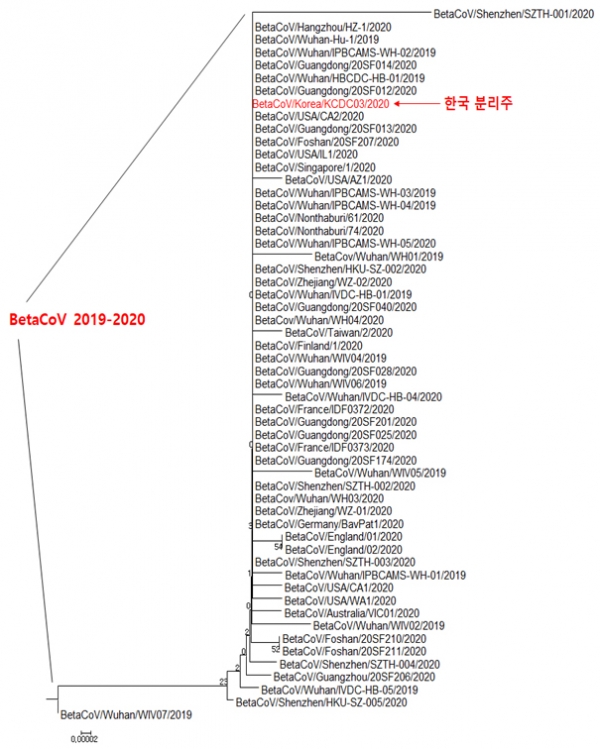 질병관리본부가 공개한 바이러스 유전정보에 따르면, 분리된 바이러스는 중국(우한, 광동), 프랑스, 싱가포르, 독일 등 국외에서 분리된 바이러스와 염기서열이 일치(99.5~99.9%)했으며, 의미 있는 유전자 변이는 발견되지 않았다.
