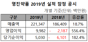 영진약품(대표 이재준)은 개별 기준 2019년 매출이 전년대비 18.7% 증가한 2213억원을 달성했다고 6일 공시했다.
