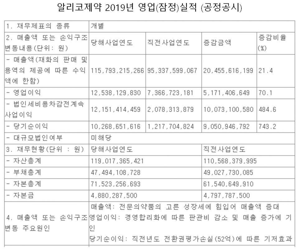 알리코제약은 7일 매출액 또는 손익구조 30%(대규모법인은 15%) 이상 변동 공시를 통해 이같이 밝혔다.