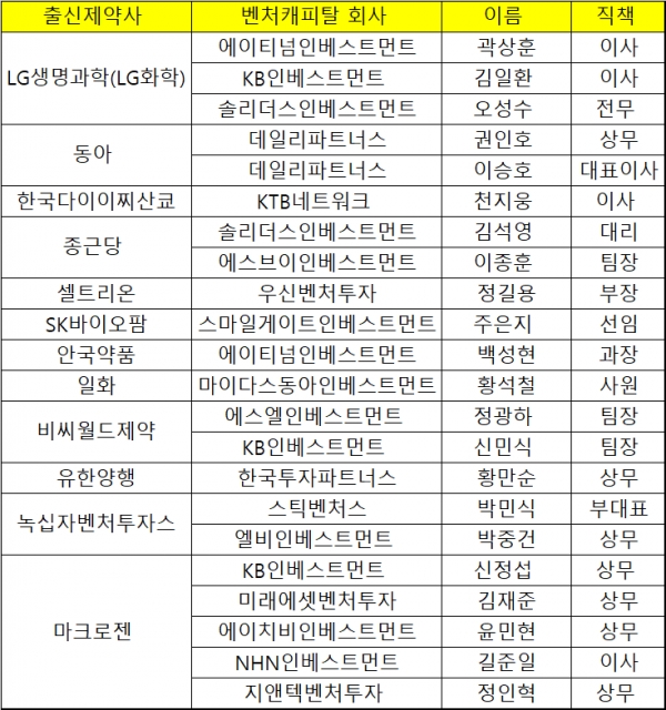 벤처투자 업계 관계자는 “벤처캐피탈 업계에서 산업체 경험을 선호하면서 IT 분야와 마찬가지로 바이오 분야에서도 제약사와 바이오벤처 출신 인력이 유입됐다”며 “2010년을 기점으로 국내 제약업계도 신약개발 연구 경험을 쌓으면서 사업개발 외에도 연구개발 경험을 쌓은 인력도 대거 유입됐는데, 특히 동아와 LG생명과학 출신이 가장 많을 것”이라고 했다.