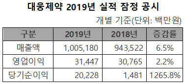 대웅제약은 "전문의약품(ETC)과 일반의약품(OTC)의 고른 성장과 보툴리눔 톡신 나보타(미국 제품명: 주보)의 미국 수출 등이 안정적인 매출 성장세를 이끌었다"며 "나보타 소송비, 라니티딘 식약처 잠정 판매중지 등 비경상적 요인이 발생했는데도 영업이익은 전년 대비 소폭 상향했다"고 설명했다.