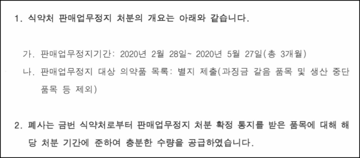 반면, 판매업무 정지는 식약처가 내린다. 동아ST의 약사법 위반 사실로 89품목에 대한 3개월 판매업무 정지 처분을 내린 것으로 보인다.