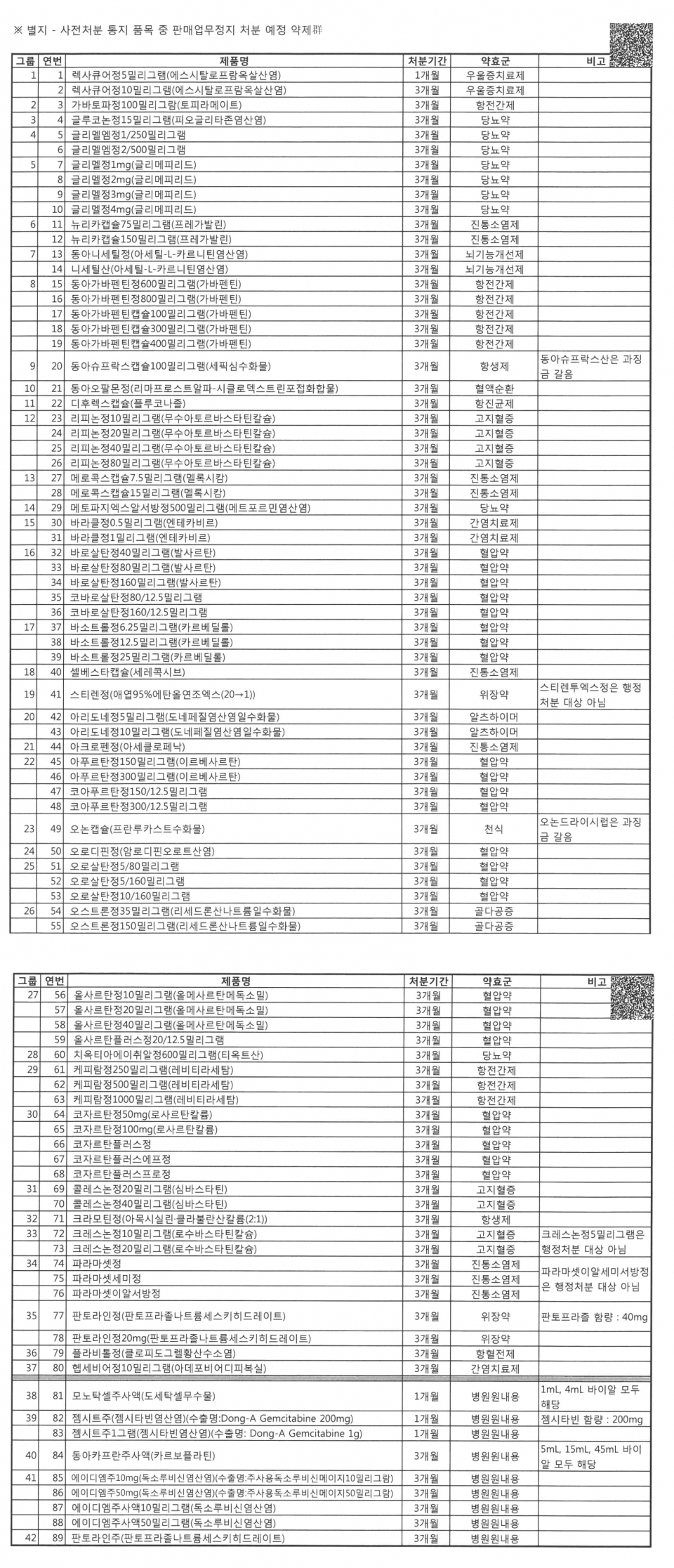 판매정지 89품목에는 주요 외래 약국에서 다빈도 처방·조제 품목인 ▷오팔몬정(혈액순환용제) ▷플라비톨정(항혈전제) ▷리피논정(고지혈증치료제) ▷스티렌정(위장약)이 포함됐다.