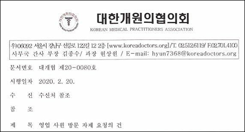 21일 관련업계에 따르면 대한개원의협의회는 영업사원 방문 자제를 요청하는 공문을 한국제약바이오협회와 한국글로벌의약산업협회에 발송했다.