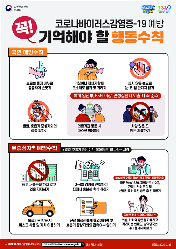 코로나19 중앙방역대책본부(본부장 정세균 국무총리)에서는 감염병 위기경보 심각단계 전환에 따라 일반국민, 고위험군, 유증상자, 국내 코로나19 유행지역을 대상으로 대국민 행동수칙을 배포하고, 이와 관련 예방수칙도 개정 배포했다.