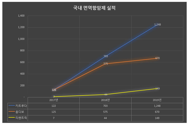 옵디보도 2018년 575억원에서 작년 670억원으로 16.5% 늘었지만, 키트루다와 격치는 2배 가까이 벌어졌다.
