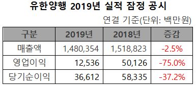 유한양행(대표이사 사장 이정희)은 연결 재무제표 기준으로 지난해 매출액이 2.5% 감소한 1조4803억원을 기록했다고 27일 잠정 공시했다. 영업이익은 75% 감소한 125억원, 순이익은 37% 감소한 366억원이었다.