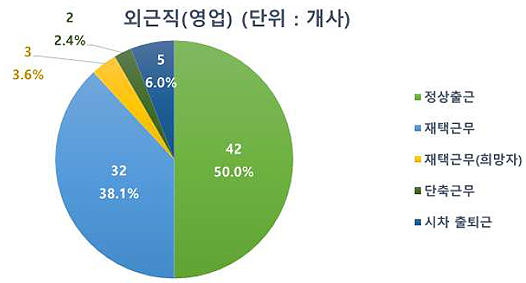 영업 근무형태=84개사 중 50%가 정상출근, 38%가 재택근무를 선택했다. 시차 출퇴근은 6%, 희망자에 한한 재택근무는 4%, 단축근무는 2%로 나타났다.