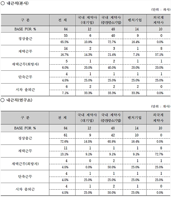연구소도 정상출근 73%·재택근무 13%로 본사와 유사했다. 희망자에 한한 재택근무와 시차 출퇴근·단축근무 비중은 각 5%로 모두 동일했다.