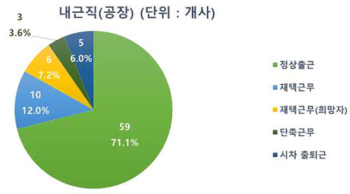 공장 근무형태=공장의 경우 84개사 중 71%가 정상출근을 택했고, 재택근무는 12%에 불과했다. 뒤 이어 희망자에 한한 재택근무 7%, 시차 출퇴근 6%, 단축근무 4% 순으로 나타났다.