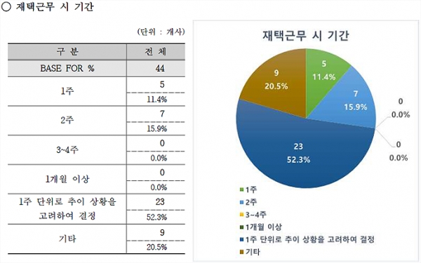 재택근무 기간=재택근무를 실시하는 44개사 대상으로 재택근무 기간을 조사한 결과 △1주 단위로 취 상황을 고려해 결정한다는 대답이 52%로 가장 많았고, 2주(16%)·1주(11%)가 그 뒤를 이었다.