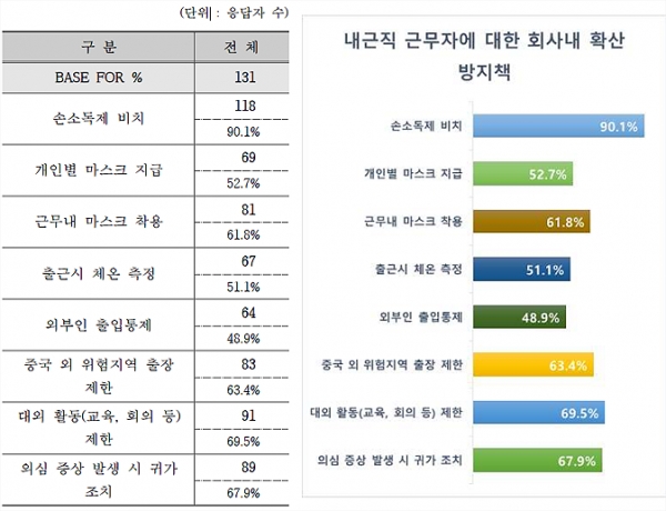 이 외 △교육·회의 등 대외활동 제한 69% △의심증상 발생 시 귀가 조치 68% △중국 외 위험지역 출장 제한 63% △근무 시 마스크 착용 62% △개인별 마스크 지급 53% △출근 시 체온 측정 51% △외부인 출입 통제 49% 등이 있었다.