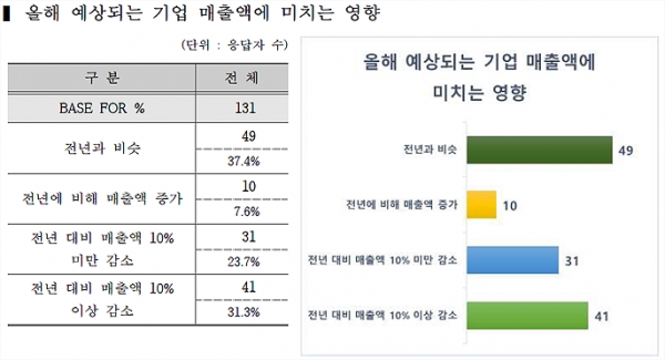 예상 매출액=84개사 131명을 대상으로 올해 예상되는 기업 매출액을 묻는 문항에서는 △37%가 '전년과 비슷할 것'이라고 예상했다. △31%는 전년 대비 10% 이상 감소 △24%는 10% 미만 감소할 것이라고 답했는데 △8%는 전년 대비 매출액이 오히려 증가할 것이라고 예상했다.