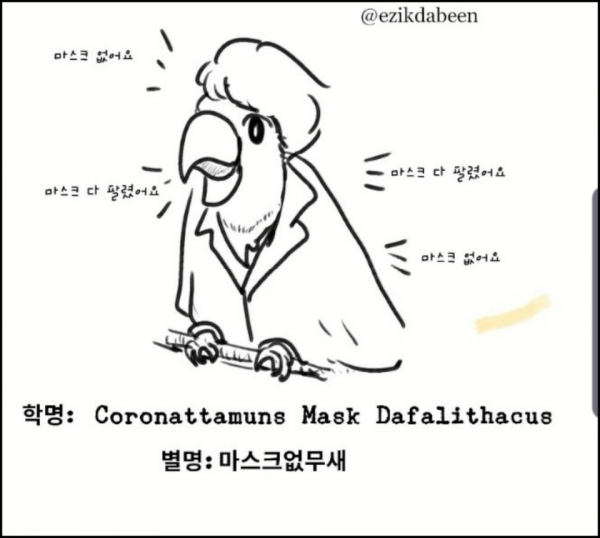 서 약사가 직접 그린 웹툰에는 "마스크 없어요" "마스크 다 팔렸어요"라는 말을 외치는 앵무새가 있었다. 학명은 'Coronattamuns Mask Defalithacus(코로나타문스 마스크 다팔리따쿠스)', 별명은 '마스크없무새'라는 내용.