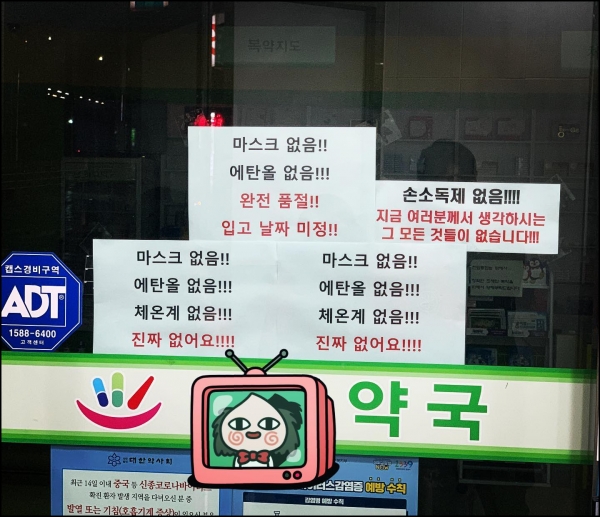 경상남도 양산시 한 약국에는 25일 "마스크 없음!! 에탄올 없음!!! 체온계 없음!!! 진짜 없어요!!!!", "마스크 없음!! 에탄올 없음!!! 완전 품절!! 입고 날짜 미정!!", "손소독제 없음!!!! 지금 여러분께서 생각하시는 그 모든 것들이 없습니다!!!!"라는 안내문 4장이 나 붙었다.