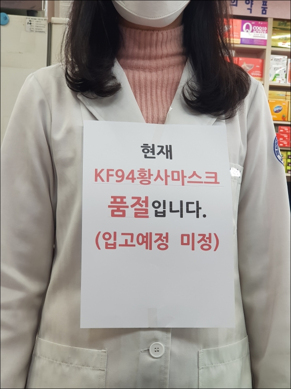 인천시 연수구약사회장을 맡고 있는 강근형 약사는 자신의 SNS를 통해 "삶의 현장의 모습이 이렇다"며 약국 근무약사가 '현재 KF94황사마스크 품절입니다. (입고예정 미정)'의 A4 용지 안내문을 붙인 모습의 사진을 올렸다.