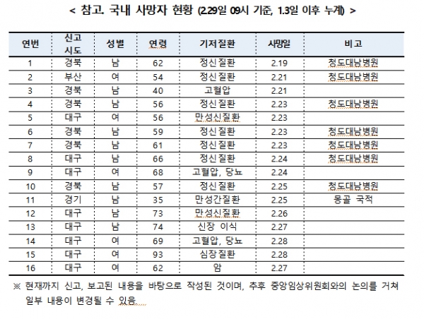 사망자 16명 중 10명이 남자, 60대 이상이 9명...기저질환 '有'