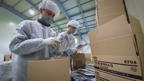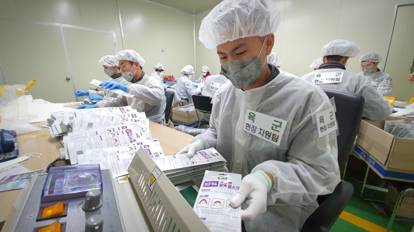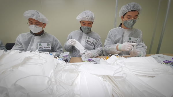 마스크 만드는 데 바빠 포장, 물량공급까지는 일손이 부족했던 업체들에 국방부가 군 장병을 투입해 지원사격에 나섰다.