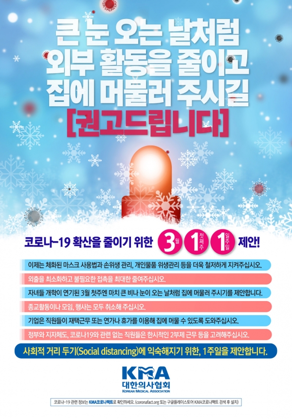 의협은 지난달 28일 발표한 권고문에서 모든 가능성을 따지면서 현장을 지원해야 하는 것이 정부의 역할, 현장에서 질병과 맞서는 것이 의료인의 역할이라면, 코로나19가 우리의 일상에서 더 이상 확산되지 않도록 하는 것이 바로 국민의 역할이라고 강조했다. 이에 따라 개학이 늦추어진 3월 첫 일주일 동안 큰 눈이 오는 날처럼 집에 머물자고 제안했다.