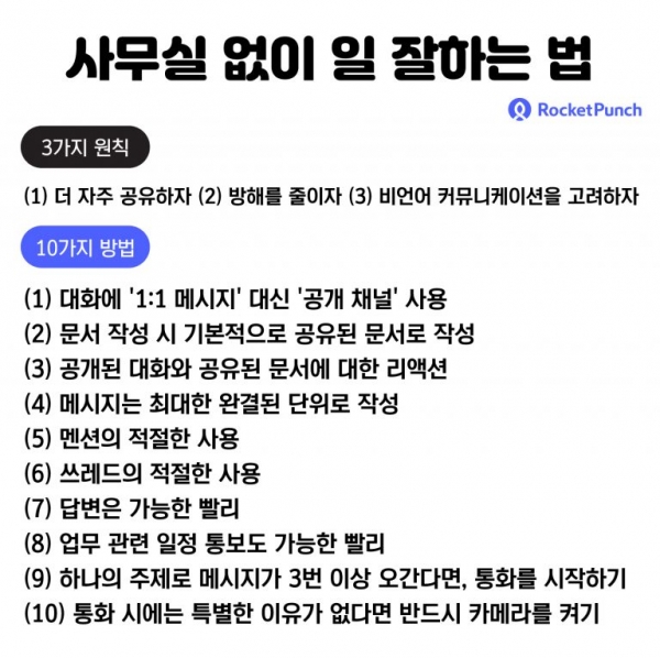 하지만 가능하다면 구성원의 리프레시를 위해서라도, 우리 팀의 일하는 방식을 보다 효율적으로 만들 수 있는 방법을 찾기 위해서라도 원격근무를 적극 고민해보시길 제안드려요. 무엇보다도 생산성을 확인하는 실험이 아니라 구성원과의 신뢰를 쌓기 위한 실천이라고 관점을 바꿔보면 더 좋겠죠?