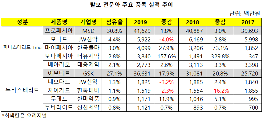 지난해 프로페시아는 전년 대비 2% 성장한 416억원의 실적으로 여전한 시장 선두를 유지했으며, 아보다트는 2016년 특허만료에 따른 약가 인하로 잠시 주춤하다가 2018년부터 성장세를 회복해 지난해 366억원의 실적을 달성했다.